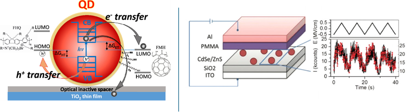 Figure caption: (Left) Photoinduced charge transfer in a QD hybridized with various acceptors. (Right) Isolated QDs embedded in a capacitor structure exhibit reversible emission changes under an applied external electric field. Adapted from ACS Omega (2019).